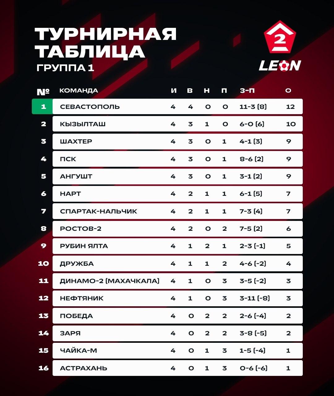 Лидером группы после 4 туров является «Севастополь», набравший 12 очков.